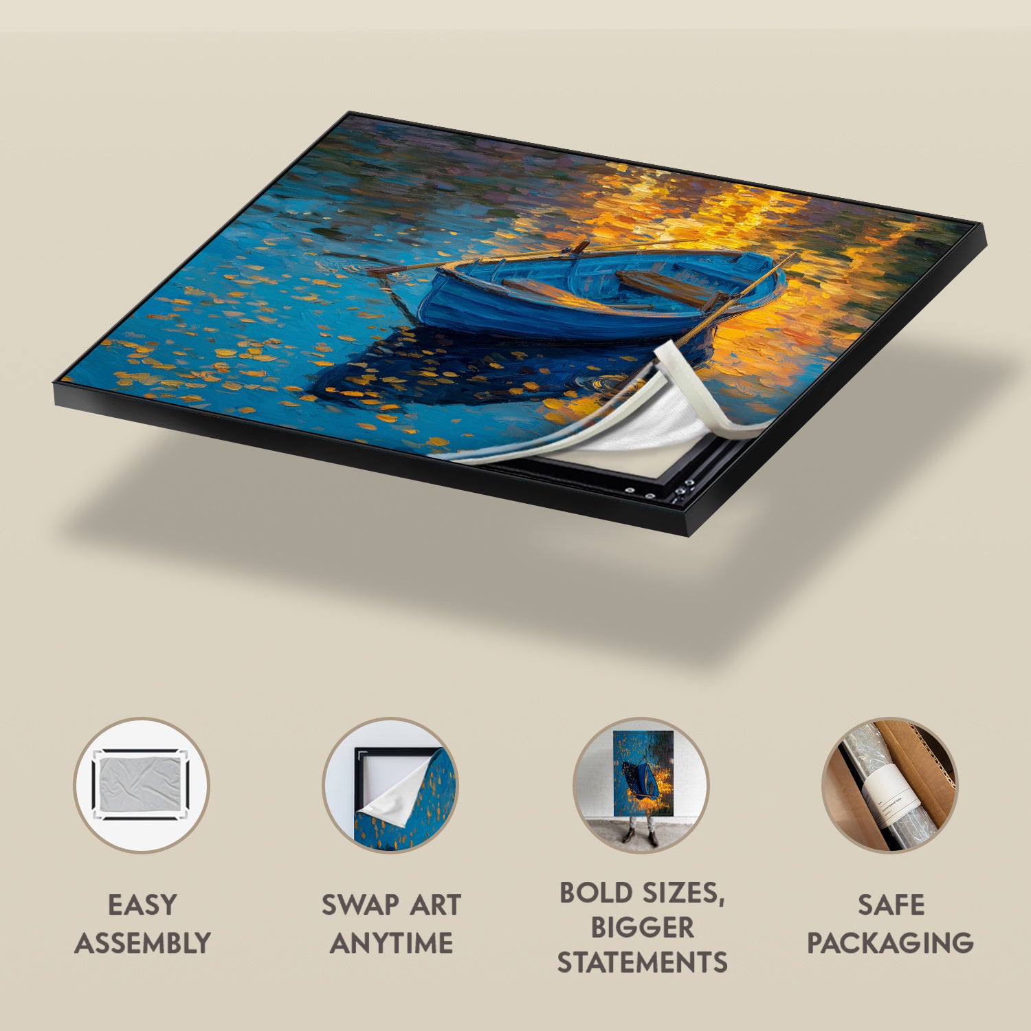 Golden Light and Blue Rowboat Oil Canvas Wall Art offers a poetic blend of tranquility and warmth. A blue rowboat floats gently among golden reflections, surrounded by scattered leaves on still water. This oil-style canvas radiates peace and introspection—ideal for reading corners, bedrooms, or quiet studio spaces. The rich blues contrast beautifully with glowing gold and orange tones, creating an emotional depth that draws the viewer in. Whether your style is coastal, rustic, or boho-chic, this piece adds soul and storytelling to your space.