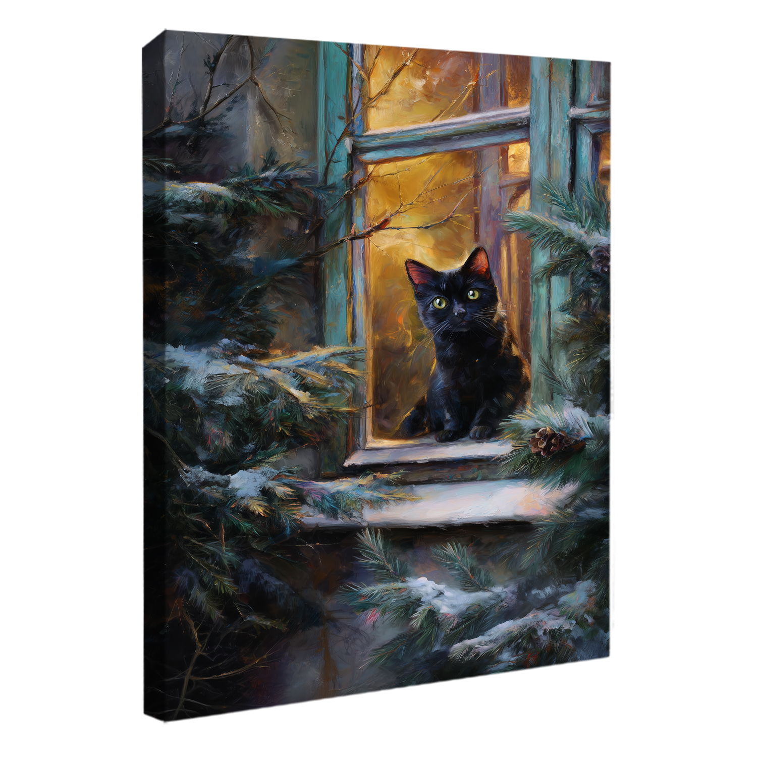 Embrace a winter night filled with warmth and quiet wonder with the Black Cat by Winter Window Oil Painting Canvas Wall Art. In this enchanting scene, a curious black cat sits perched at an old wooden window, its bright green eyes glowing against the golden light from inside. Framed by snow-dusted pine branches and frosted glass, the composition blends cozy indoor warmth with the stillness of a cold winter evening — a gentle moment of magic and curiosity. Ideal for rustic, cottage, Scandinavian, or holiday-themed interiors, this piece adds a touch of storytelling charm to bedrooms, living rooms, and reading nooks.