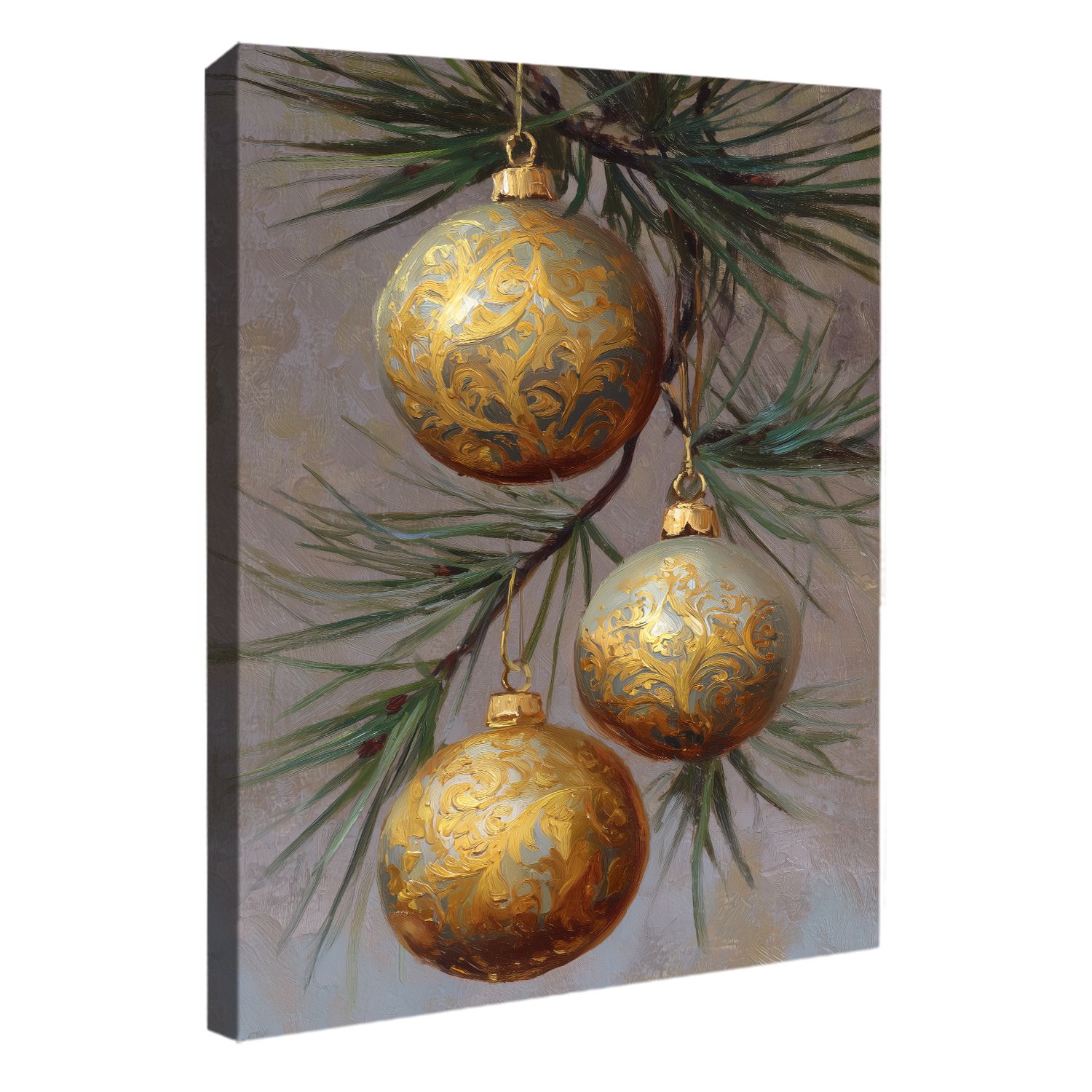 Golden Christmas Ornaments Hanging on Pine Oil Painting
