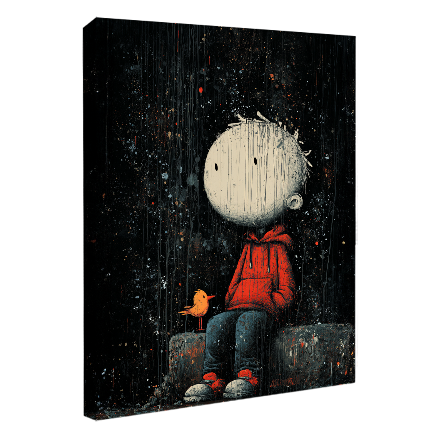 Contemplate solitude and connection with the Lonely Boy and Bird Street Art Canvas Wall Art. Against a dark, dripping background, a small figure in a red hoodie sits quietly beside a tiny yellow bird — a poetic contrast between innocence and melancholy. The expressive splatters and moody tones give this piece a raw, emotional depth that speaks to the soul. Perfect for bedrooms, studies, or creative corners, it evokes introspection and quiet resilience.