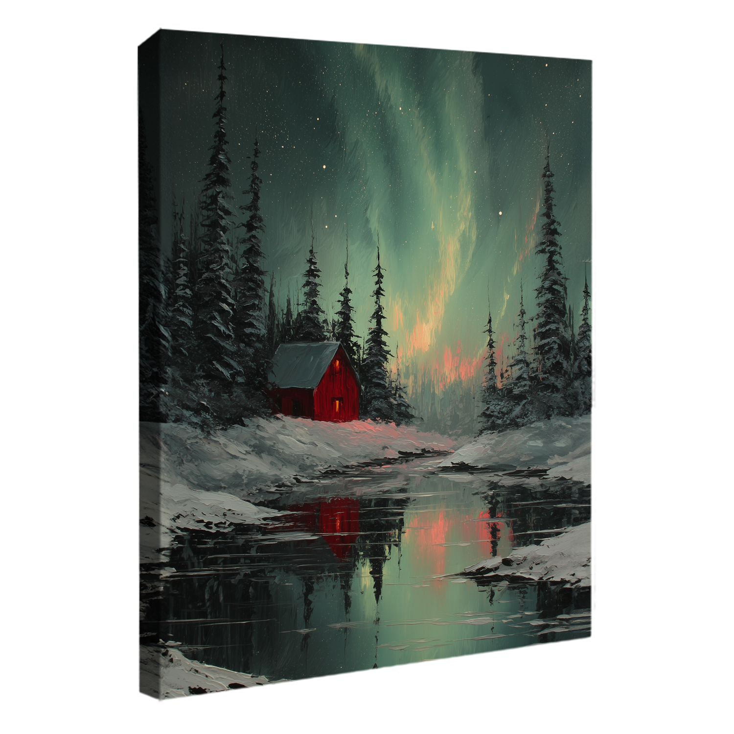 Experience the wonder of the polar night with the Northern Lights Red Cabin Winter Landscape Canvas Wall Art. Beneath sweeping green and rose auroras, a vivid red cabin glows gently by a frozen river, mirrored across its icy surface. The interplay of celestial color and snowy stillness evokes a sense of awe — nature at once vast, quiet, and alive with light. Perfect for modern, rustic, or lodge-inspired interiors, it lends a dramatic yet peaceful ambience to living rooms, bedrooms, and winter retreat spaces. A portrait of solitude illuminated by the northern sky.