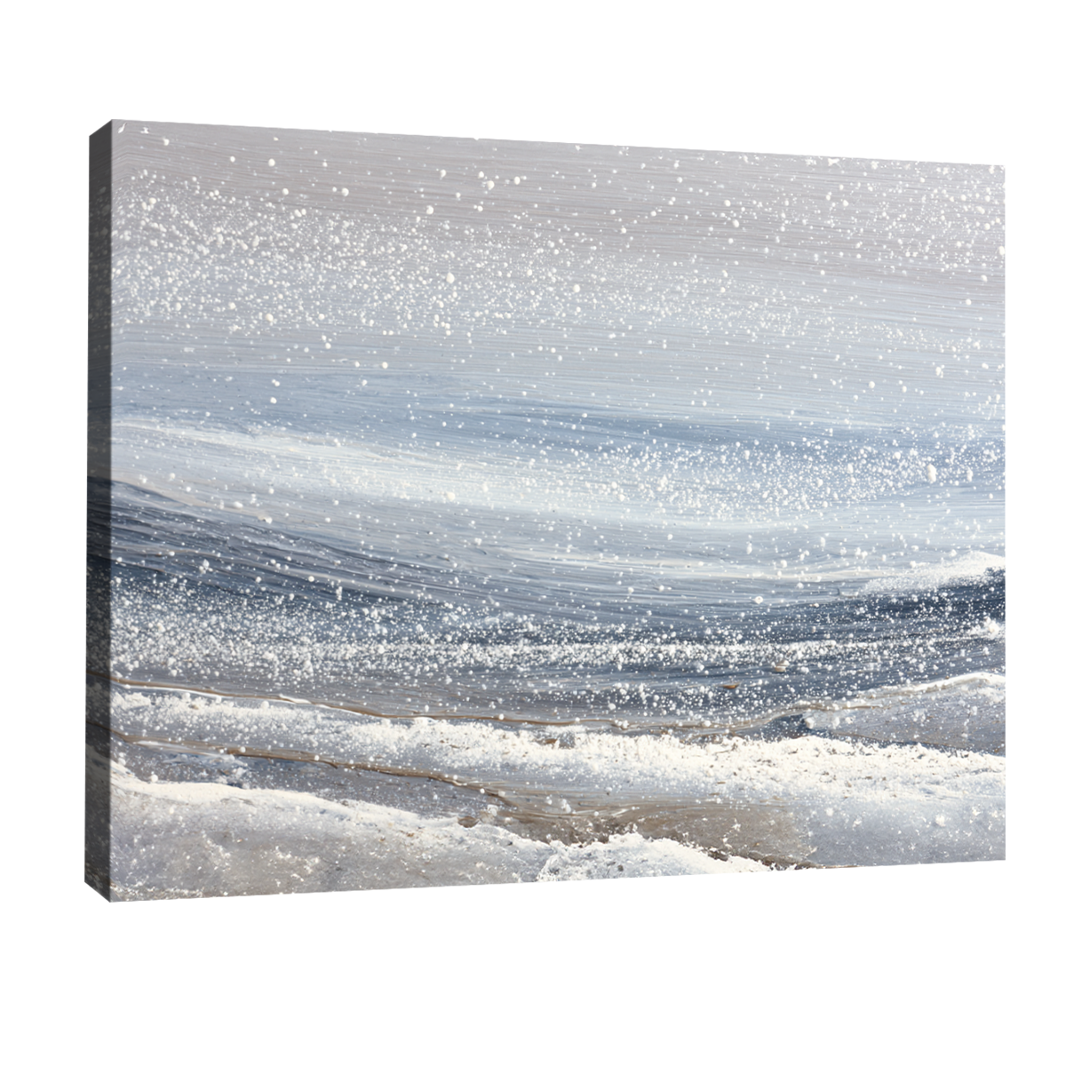 The Snowfall Motion Abstract Canvas Wall Art artwork captures the gentle rhythm of falling snow through sweeping brushstrokes and layered splatters of white. Soft gradients of grey, blue, and pearl tones blend into a serene winter flow, while delicate paint droplets create the illusion of snowflakes drifting through the air. Its minimalist, fluid composition brings calm and spaciousness to any room—perfect for Scandinavian, coastal, or modern décor.