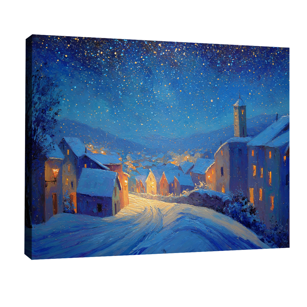Invite winter magic into your space with the Snowy Blue Night Town Oil Style Christmas Canvas Print, an enchanting scene painted in rich, expressive oil textures. This artwork evokes the peaceful charm of a quiet town under a star-filled winter sky with warm golden lights glowing from each home. The deep blues, soft whites, and amber tones create a serene contrast that fits beautifully in living rooms, fireplaces, reading corners, and seasonal display walls. Its thick brushstrokes and painterly texture give the print a fine-art quality, adding elegance and emotional warmth to any holiday setting. Ideal for enhancing cozy winter décor, Scandinavian themes, or rustic interiors, this canvas brings a sense of peace and nostalgia.