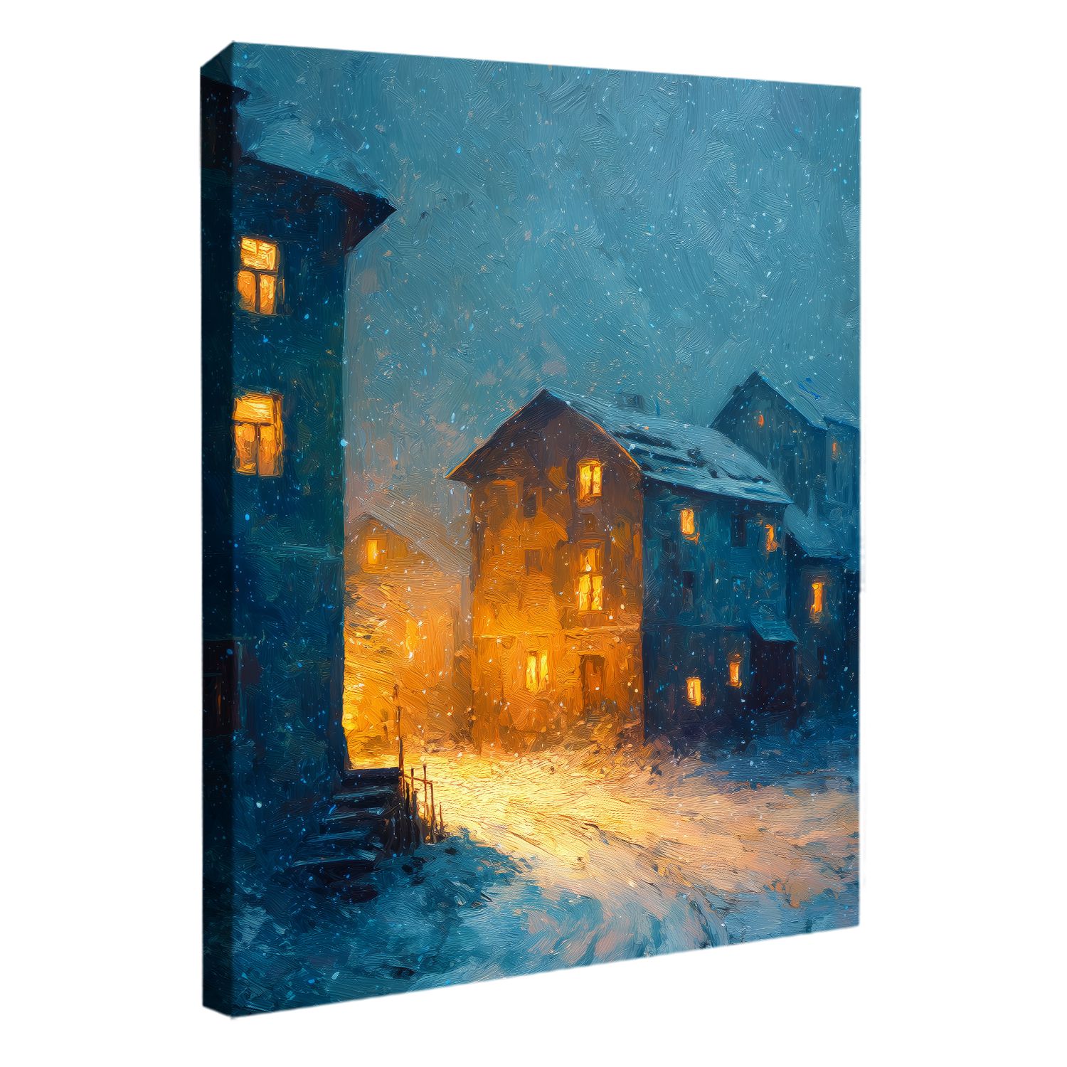 Illuminate your walls with the cozy charm of the Snowy Village at Night Oil Paint Print Canvas Wall Art. This enchanting piece depicts a small alpine town aglow with golden light during a gentle snowfall. The interplay between cool blue shadows and warm amber windows evokes feelings of nostalgia, warmth, and community — the essence of winter comfort. Every brushstroke reflects the shimmering texture of oil paint, bringing life and motion to the snowy evening.