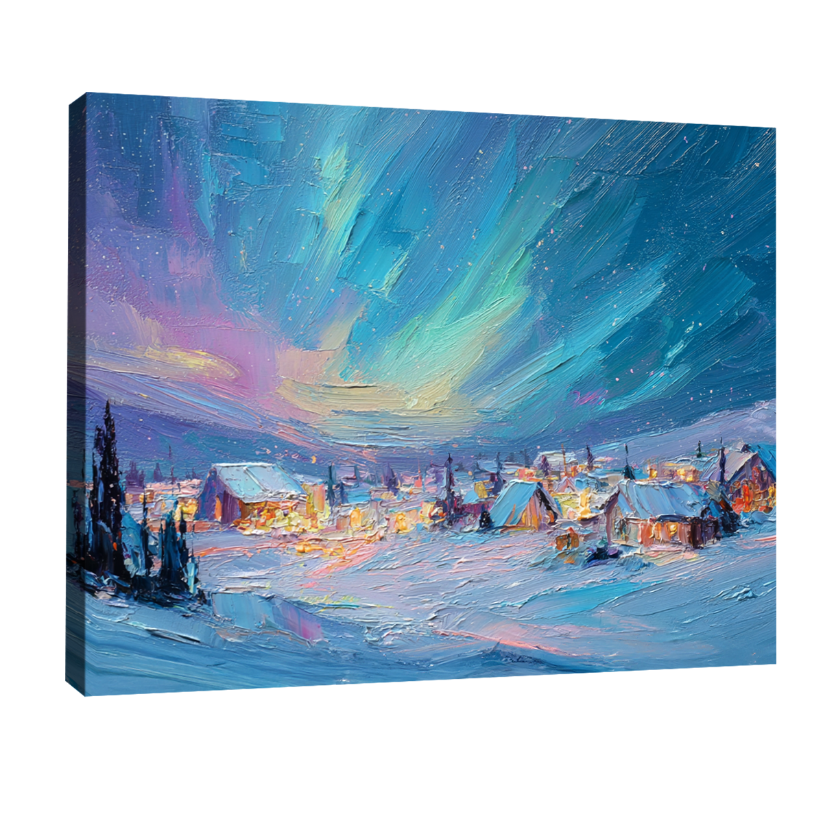Experience the wonder of a winter night illuminated by dancing colors with Vibrant Aurora Winter Village Night Oil Style Canvas Art. This expressive artwork portrays a glowing snow-covered village under sweeping aurora lights in blues, purples, and soft pastels. The rich oil-style strokes add movement, texture, and emotional depth, making the piece a stunning centerpiece for modern, eclectic, and contemporary interiors.Perfect for living rooms, creative studios, and cozy reading spaces, this canvas brings energy and warmth while still maintaining a dreamy, atmospheric calm.
