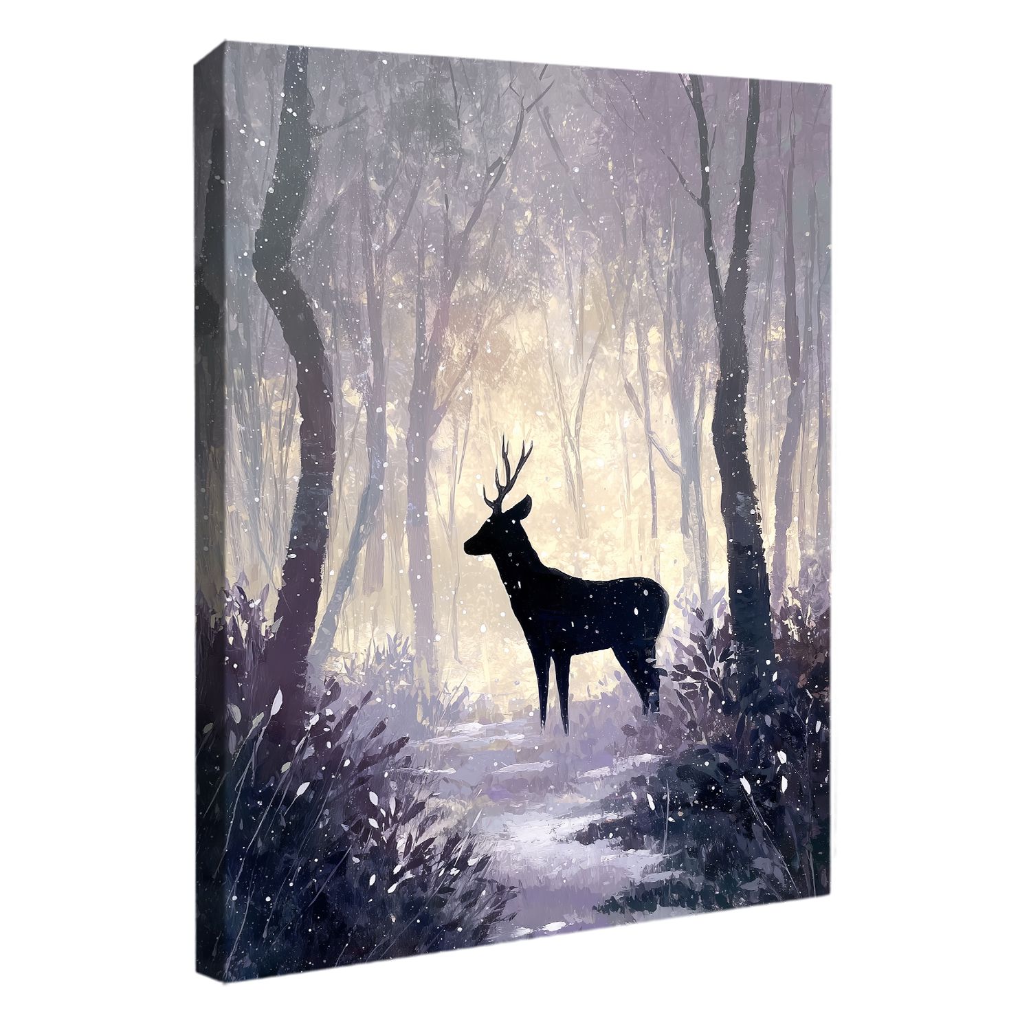 Step into a world of quiet wonder with the Winter Deer Silhouette in Snowy Forest Canvas Wall Art. A graceful stag stands still beneath softly falling snow, surrounded by a dreamlike woodland bathed in pale lavender, ivory, and misty gray. The delicate interplay of light through the trees evokes a moment of pure serenity — nature paused in reverence. Ideal for modern, Scandinavian, woodland, or minimalist interiors, it brings a poetic seasonal charm to bedrooms, living rooms, and entry spaces.