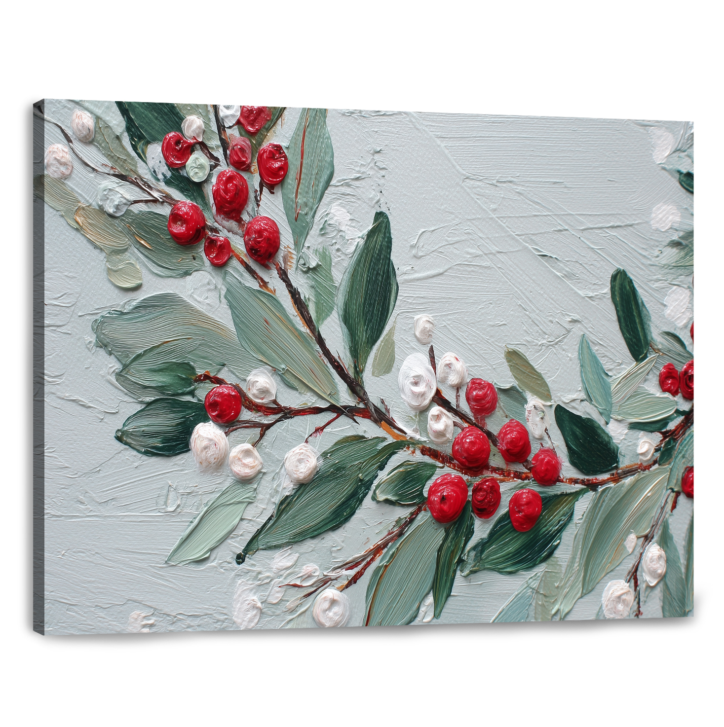 Celebrate the quiet elegance of the winter season with the Winter Holly Berry Branch Textured Oil Painting. This intimate composition highlights clusters of red and white berries nestled among cool green leaves, sculpted with rich palette-knife strokes for a three-dimensional effect. The soft sage-toned background enhances each detail, creating a serene yet festive visual experience reminiscent of hand-crafted Christmas florals. Ideal for farmhouse, Scandinavian, botanical, or minimalist interiors, it brings a touch of organic elegance to dining rooms, kitchens, bedrooms, or entryways.
