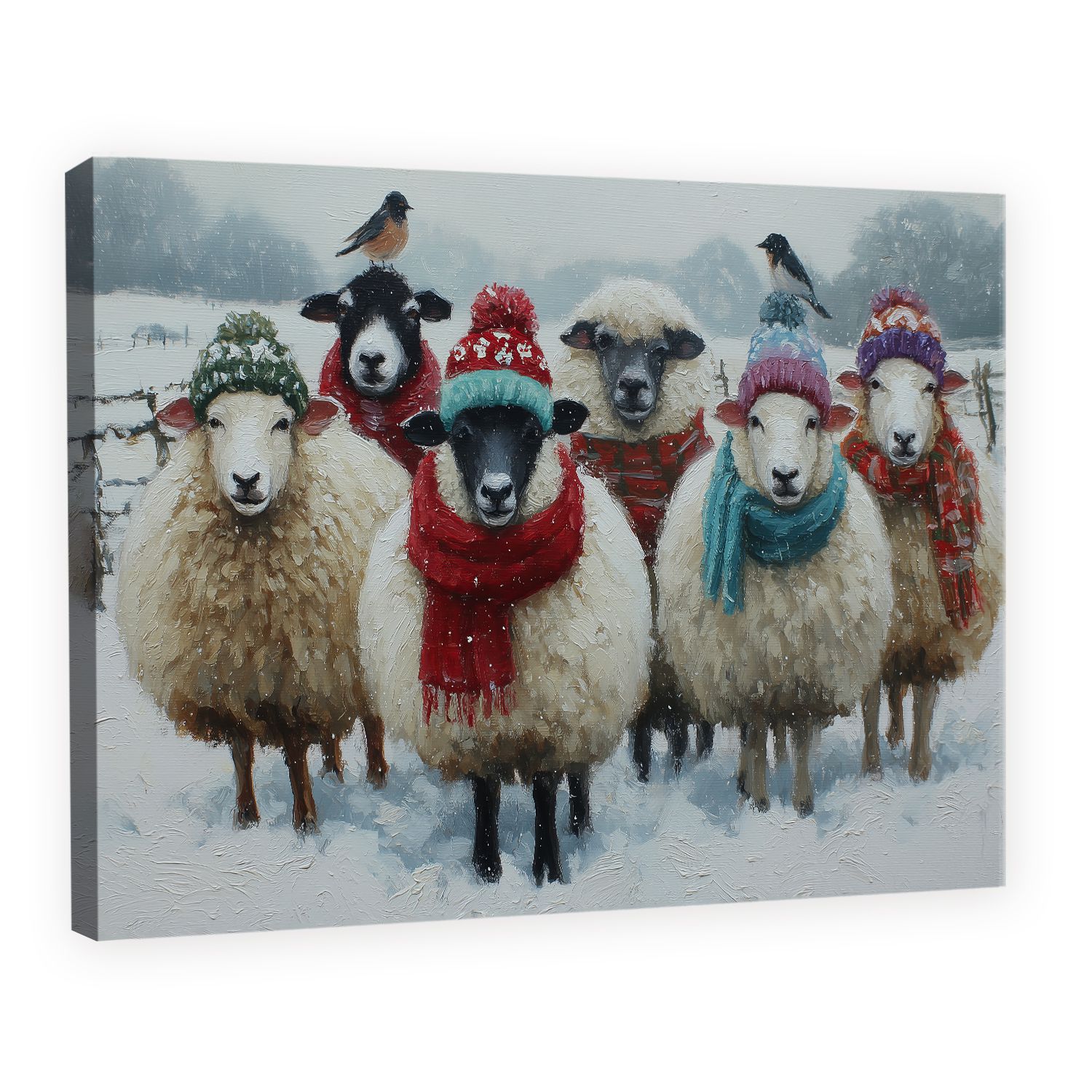 Add a touch of whimsical charm to your walls with the Winter Sheep in Cozy Scarves Oil Paint Print Canvas Wall Art. This delightful piece features a flock of sheep bundled in colorful hats and scarves, standing together in a peaceful snow-covered field. Each character seems to have its own personality, painted in thick, textured brushstrokes that capture the humor and heart of winter countryside life. The scene’s soft grays, whites, and cheerful reds create a warm contrast, brightening any space with rustic coziness.