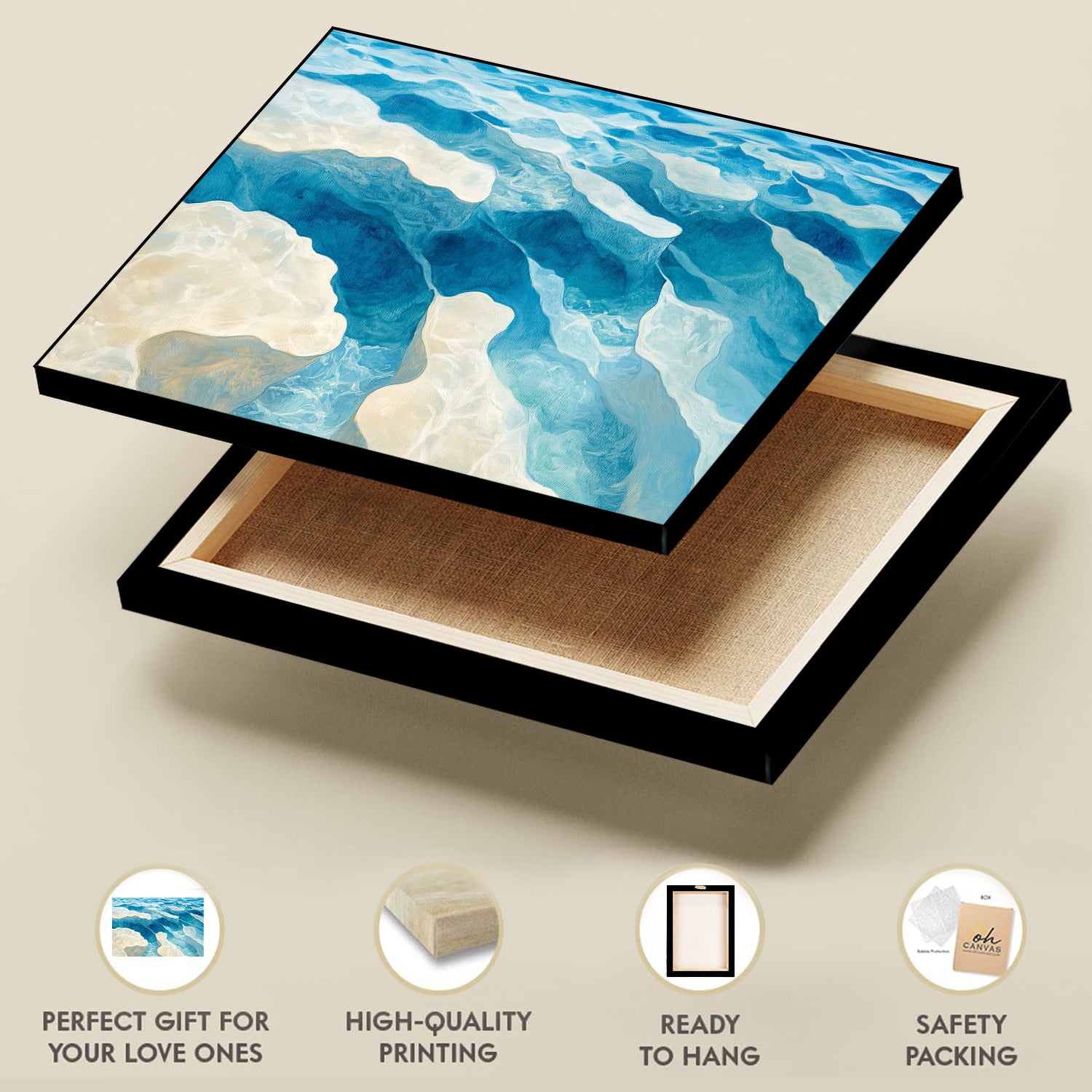 Transform your walls into a breathtaking bird's-eye view of the ocean. Aerial Ocean View Acrylic Painting Coastal Canvas Art captures the rhythmic beauty of sea and sand from above, blending swirling blues and tans into a captivating modern abstract. This acrylic canvas is ideal for contemporary homes, ocean-inspired interiors, or offices that crave clarity and calm. With its satellite-map aesthetic and smooth, flowing design, it complements minimalist furniture, white walls, and natural wood accents.