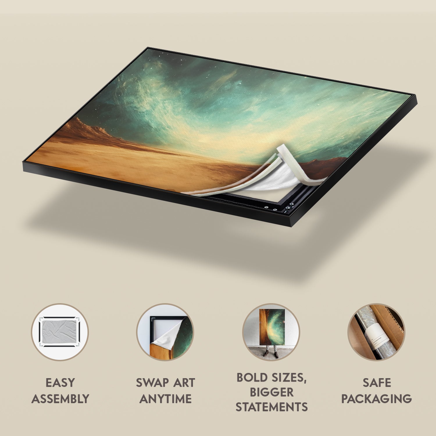 We offer a Large Wall Art Frame as a one-time purchase. Simply swap out the canvas with our “ART REPLACEMENT ONLY” prints to refresh your space without buying a new frame.
